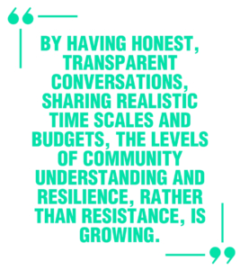 The Regeneration Team is staffed by dedicated council officers that want to make change happen too. They strive to resolve conflict and misinformation through meaningful connections, working hours beyond the standard 9-5, adapting to the local needs to interact directly with those who call the valley home. By having honest, transparent conversations, sharing realistic time scales and budgets, the levels of community understanding and resilience, rather than resistance, is growing.