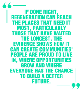 If done right, regeneration can reach the places that need it most, particularly those that have waited the longest. The evidence shows how it can create communities’ people are proud to live in, where opportunities grow and where everyone has the chance to build a better future. That has to be our legacy from this once-in-a-generation opportunity to deliver wholesale, meaningful change for future generations.